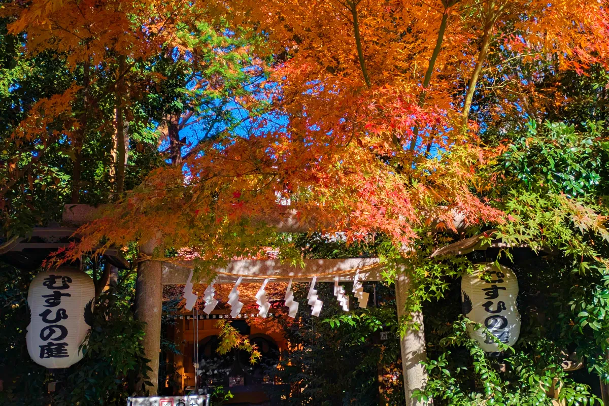 また、むすひの庭の紅葉も鳥居にかかるように。