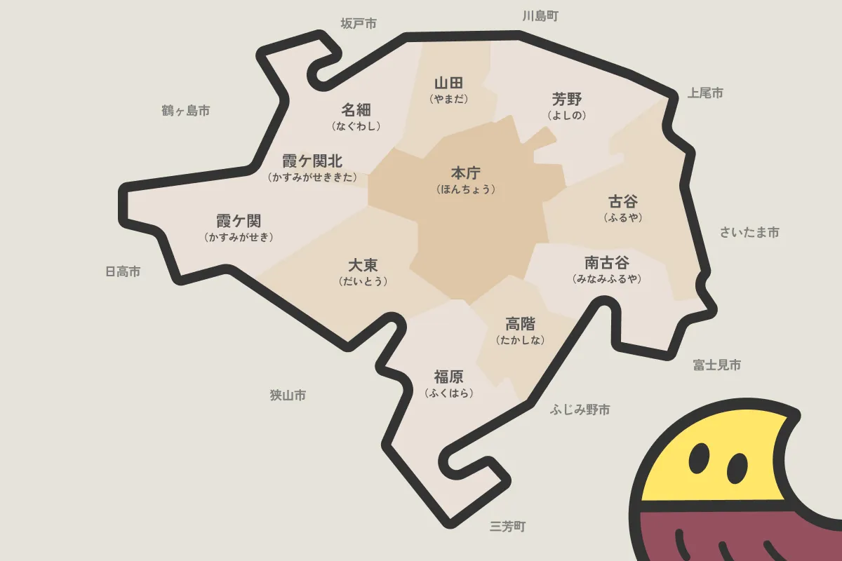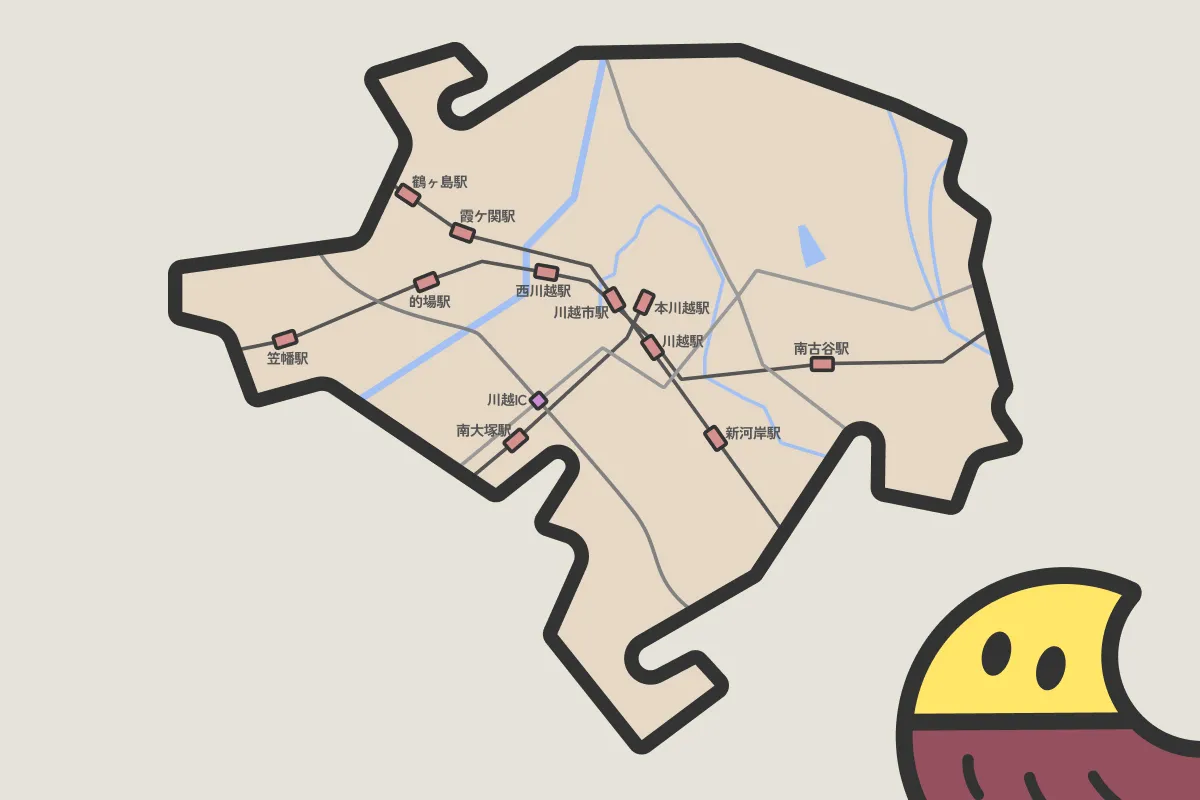 川越市は、川越市役所のある本庁地区・観光地エリアをはじめ、周辺は工場・農場・住宅街とさまざまな街並みが広がります。