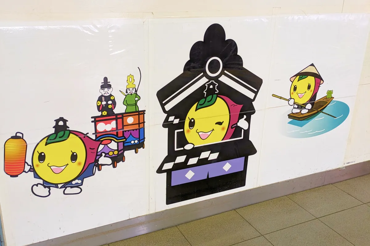 川越観光の定番駅で、駅構内にはたくさんのときもや川越の写真・イラストがあります。