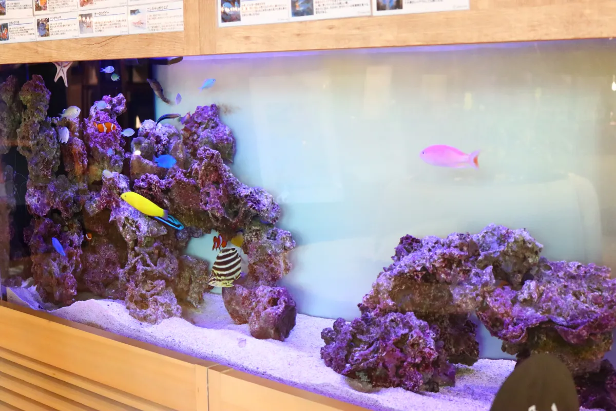 とてもきれいで、緑や水槽のあるオフィス。フリーアドレスを採用しています。