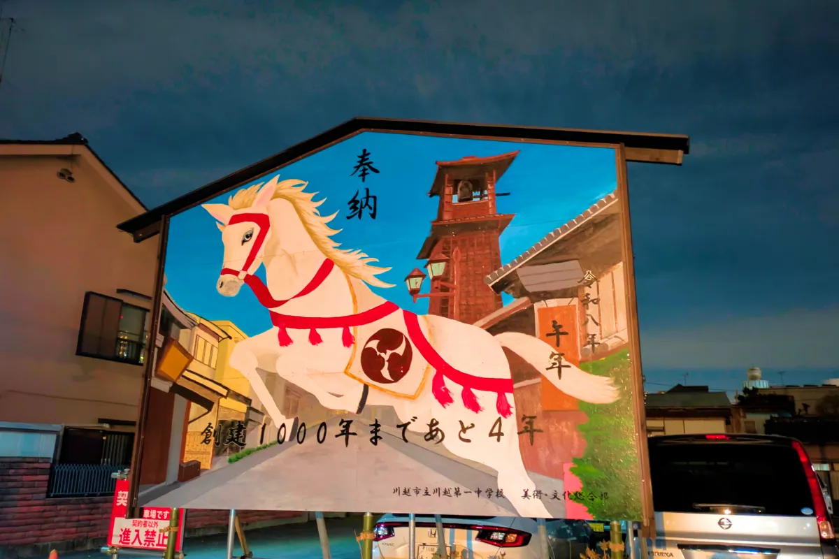 川越八幡宮では、川越市立第一中学校の美術・文化総合部など、生徒さんによるジャンボ絵馬が飾られています。