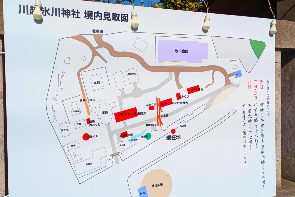 川越氷川神社境内は、初詣シーズンのみお守りやおふだ・破魔矢などの場所が点在しています。