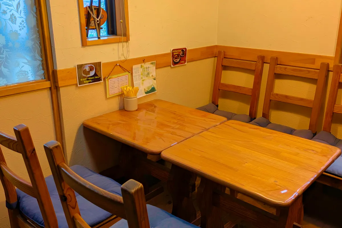 釜銀は、テーブル席中心の店内。カウンター席もあります。
