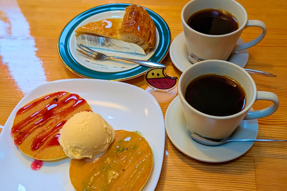 分厚いホットケーキとコーヒーが味わえるスイーツのセットとなっています。