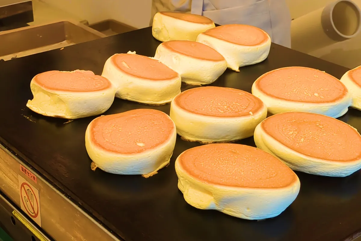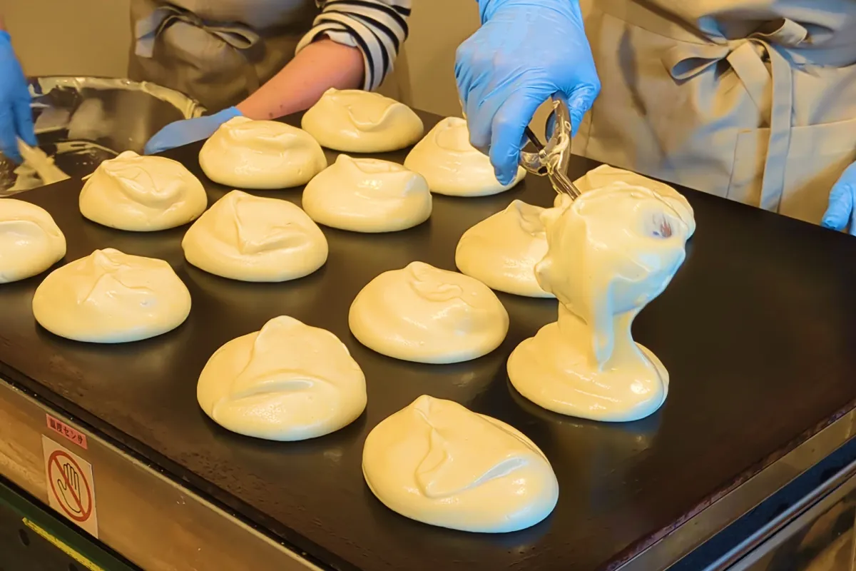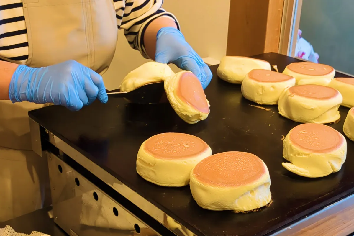 龜屋 kashichiでは、店内でスフレ生地を焼き上げます。