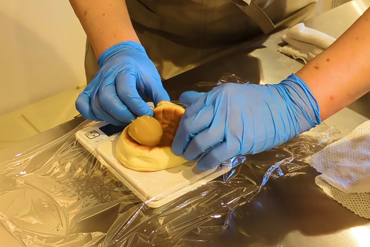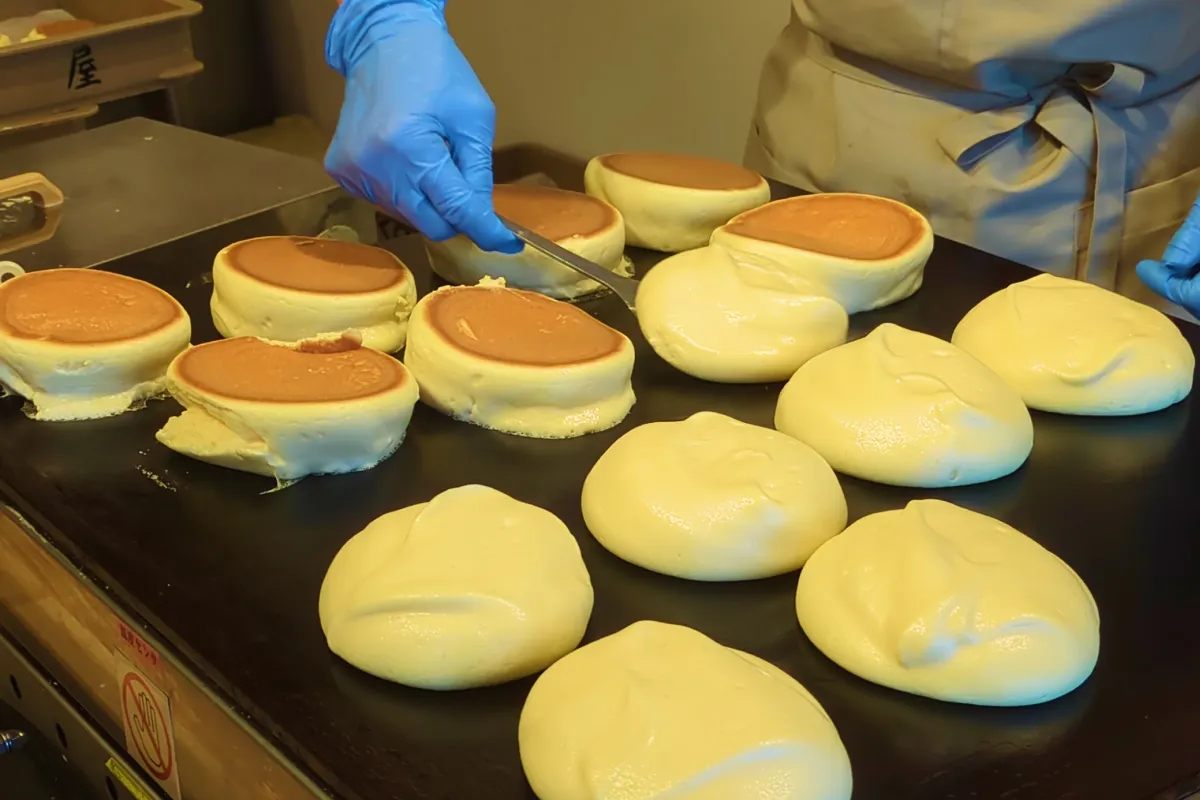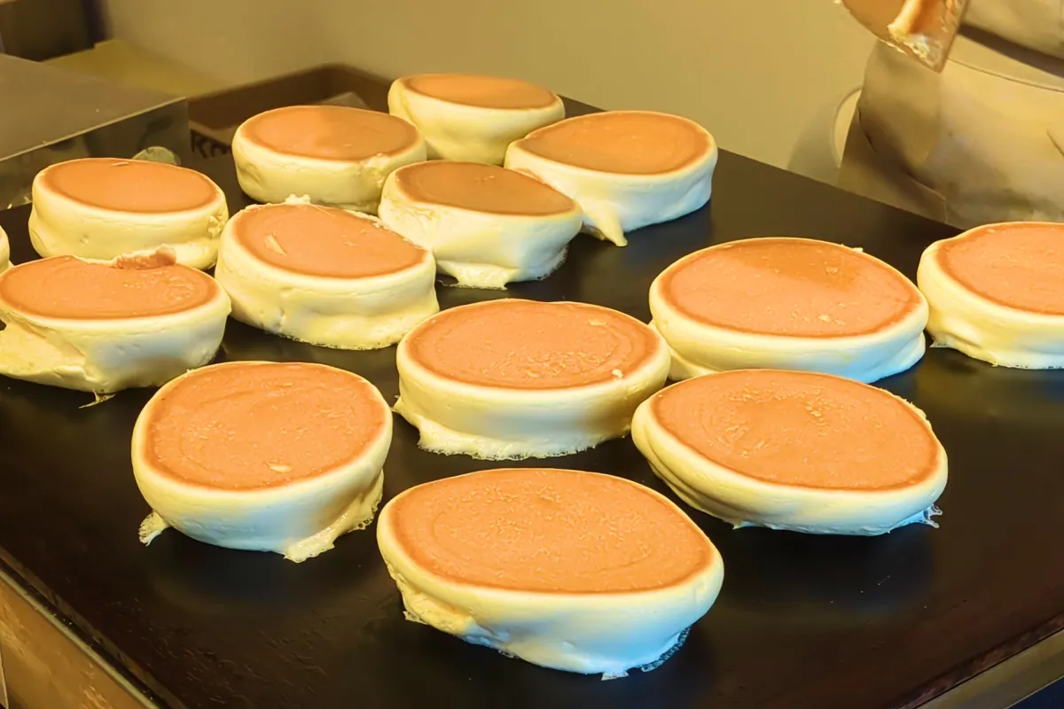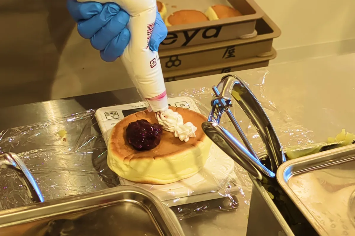 龜屋 kashichiでは、店内でスフレ生地を焼き上げます。