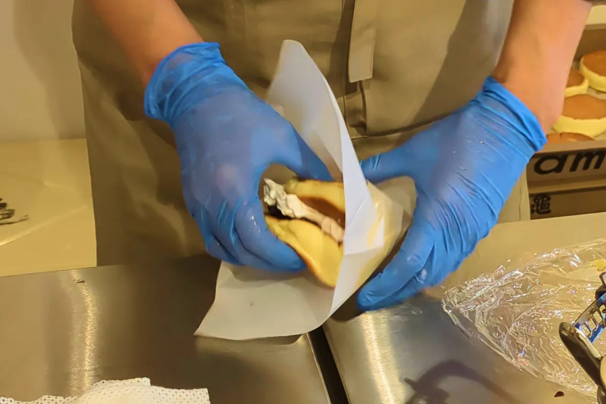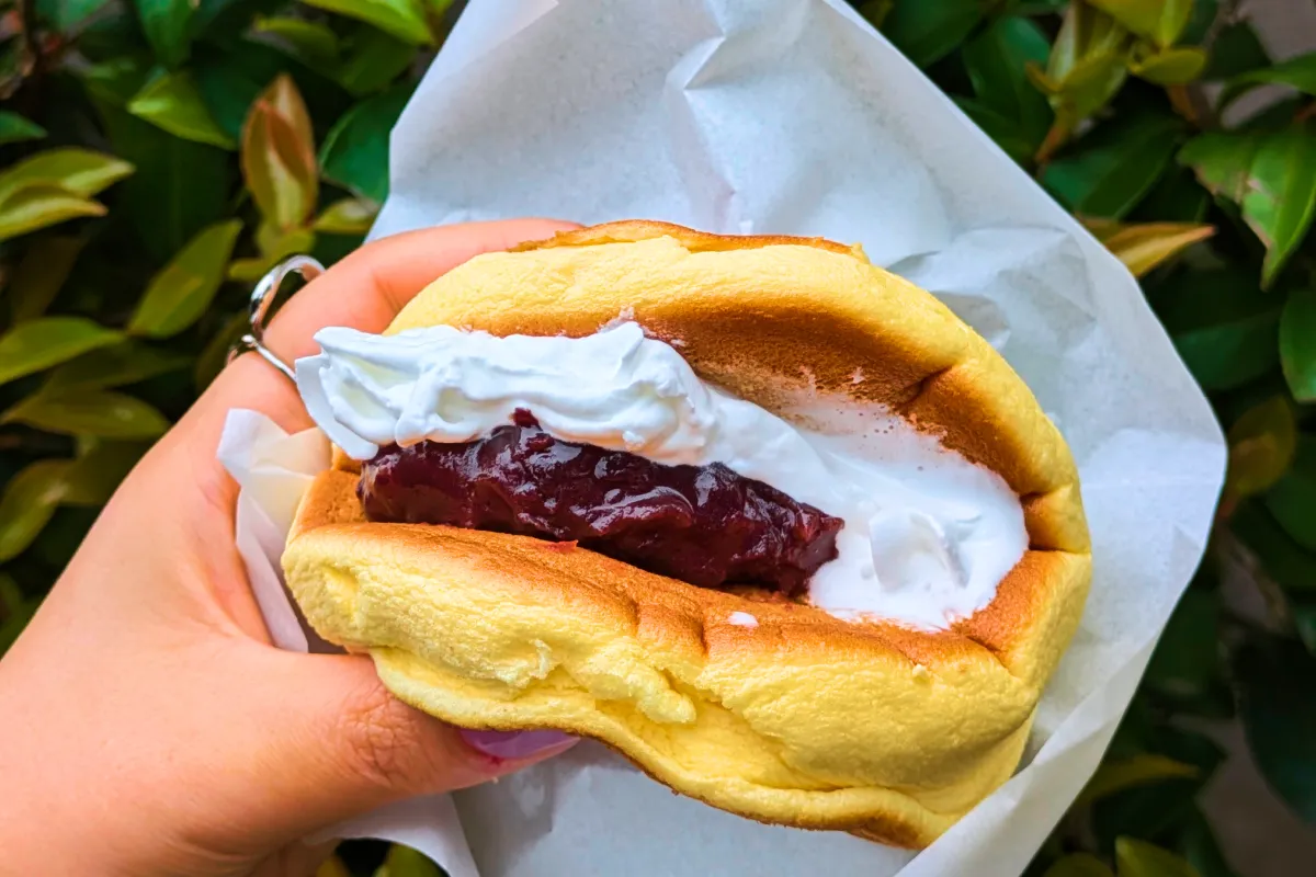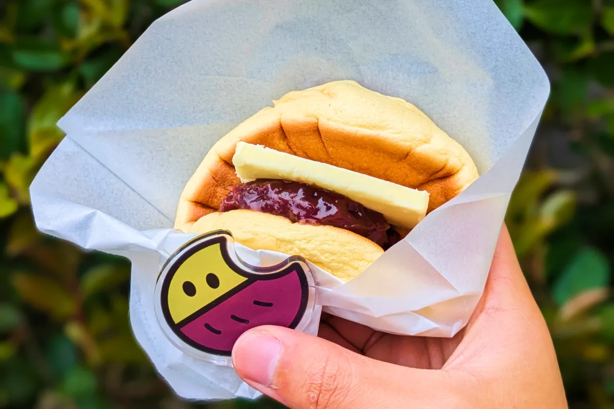白と黒のコントラストに、黄色くきれいなすふどらが挟まった見映えも抜群な食べ歩きメニューとなっています。