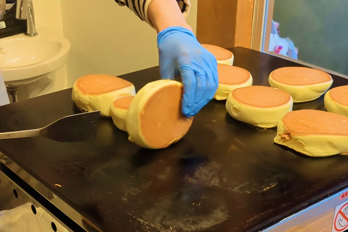 龜屋 kashichiでは、店内でスフレ生地を焼き上げる様子を見ることができます。