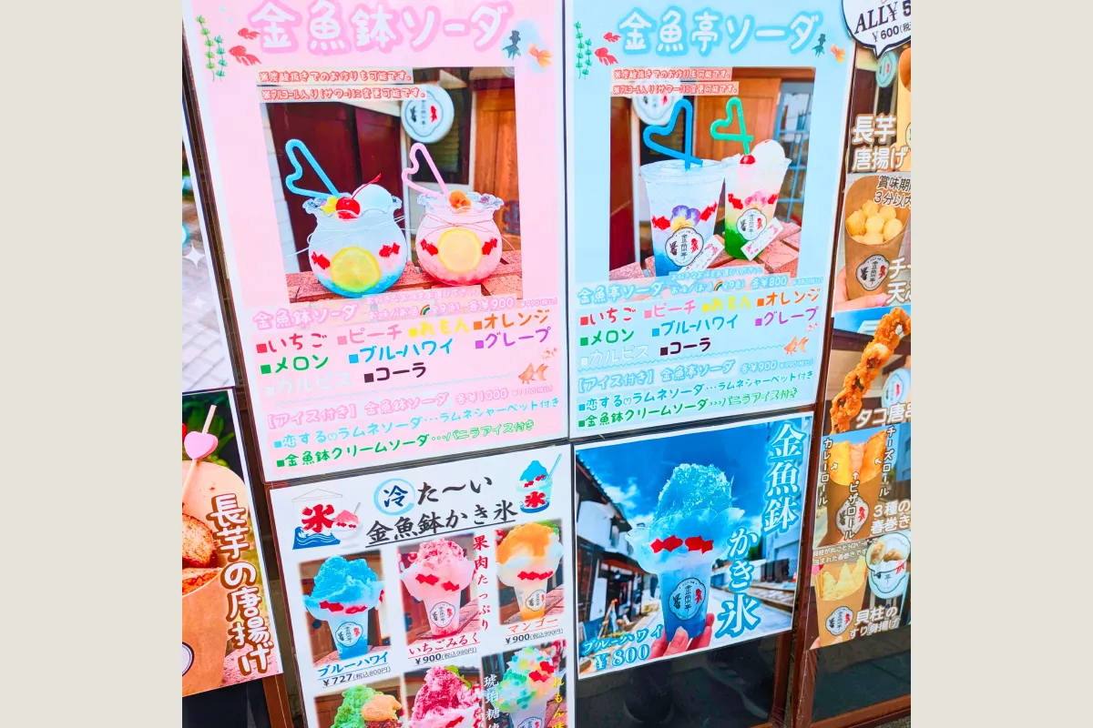 金魚亭 大正浪漫通り店では食べ歩きメニューを中心に人気の金魚鉢ソーダやタコ唐串などを提供しています。