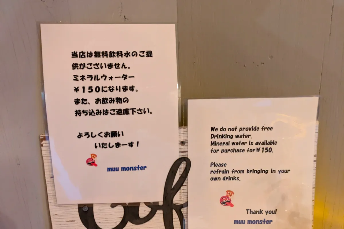muu monsterは無料飲料水の提供はありません。ミネラルウォーターは有料になります。