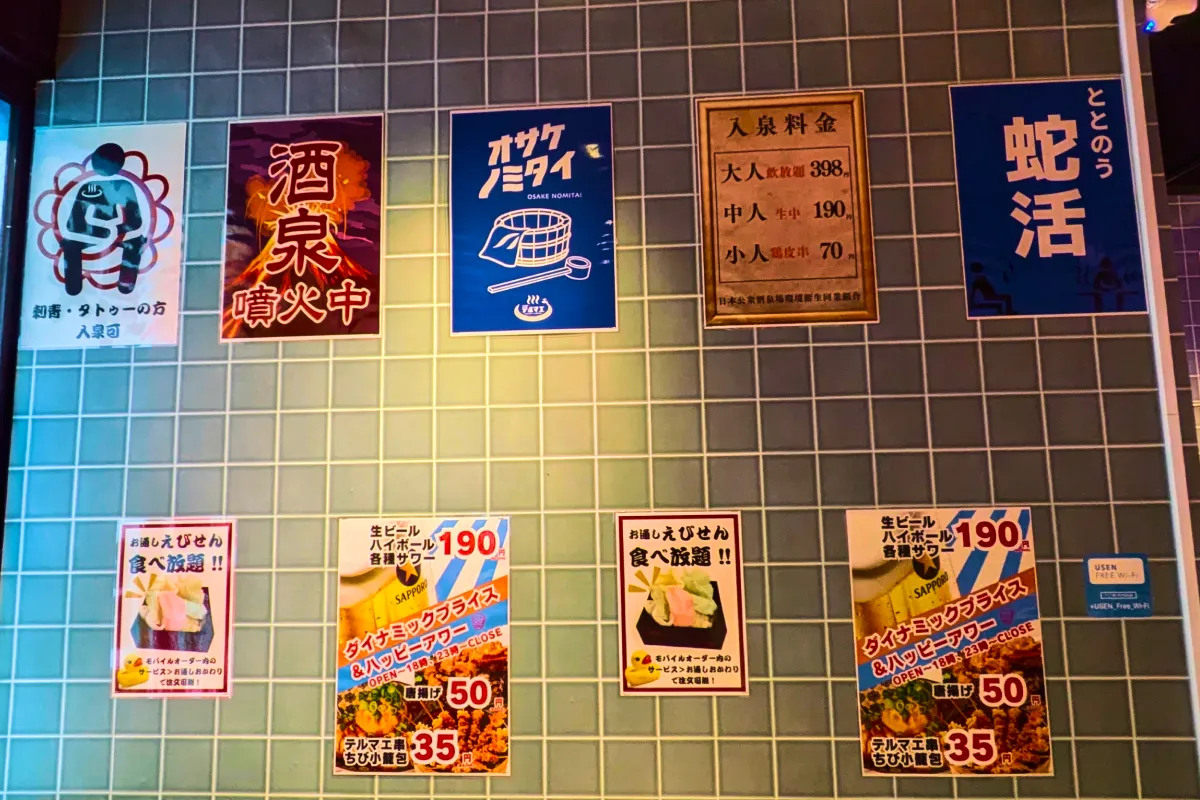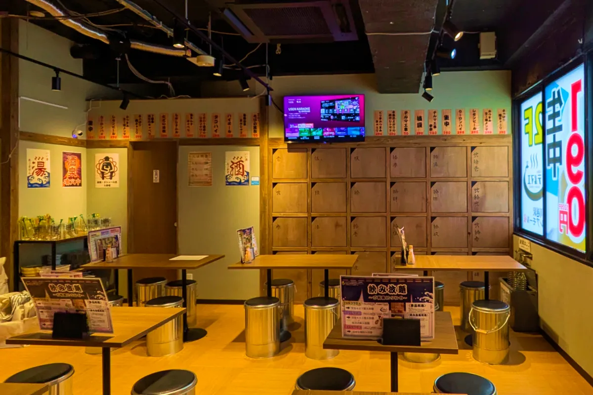 タイルの壁や昭和レトロなポスター、銭湯キーのようなメニュー札、脱衣所のロッカーのような荷物ロッカーなどなど。