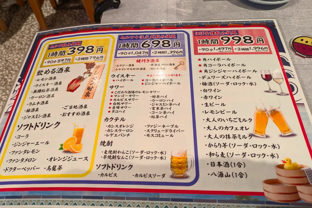 セルフ+注文式飲み放題(1時間 698円 / 90分 1,047円 / 2時間 1,396円)