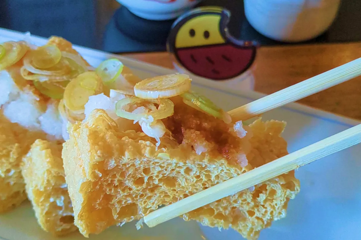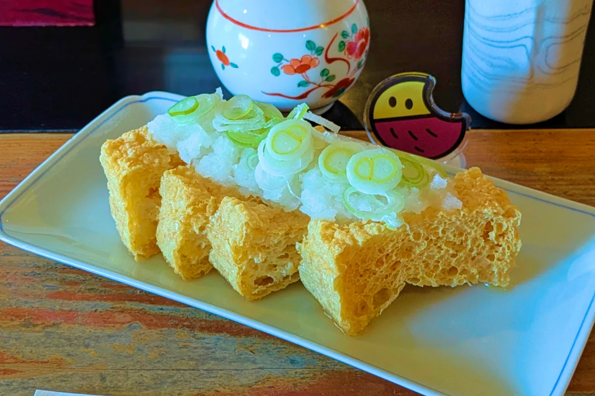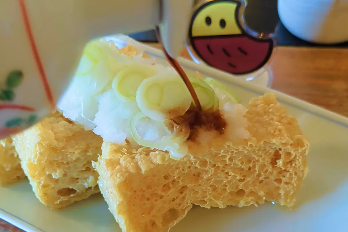 油揚ステーキのうえにかかった大根おろしと白ネギに、醤油をかけて味わいます。