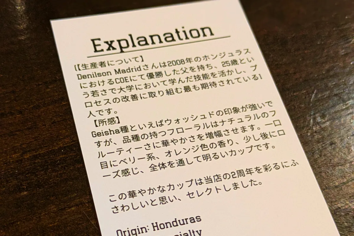 店主さんが味わいや特徴について記載したコーヒーカード付き。