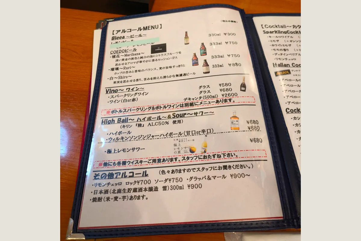 アルコールメニューもビール、ワイン、ハイボールと種類豊富。