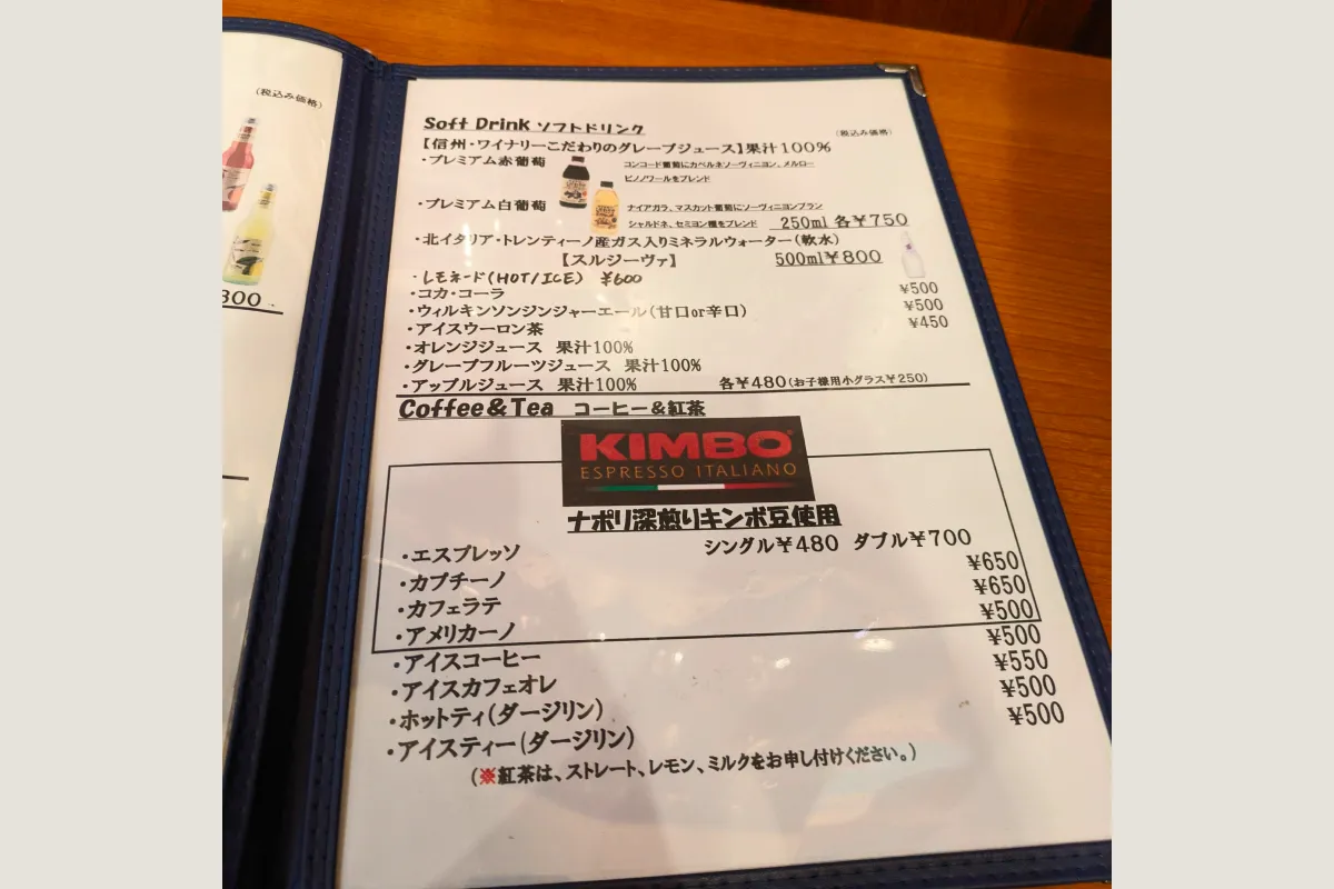 ソフトドリンクでもワインの香りを楽しめるものや、ナポリ深煎りキンボ豆を使用したエスプレッソなども提供しています。