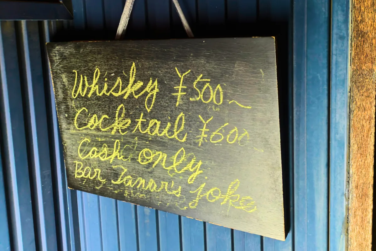 ターナーズジョークの店頭には、おおまかなメニューの価格帯と現金オンリーの看板があります。