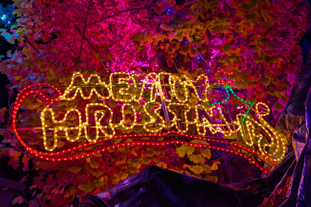敷地内の教会は周辺の木々を中心に、赤・紫・青・緑とカラフルなイルミネーションが張り巡らされています。