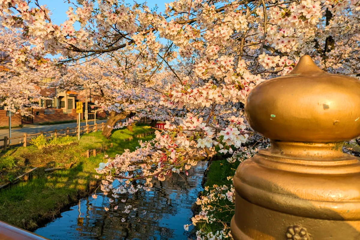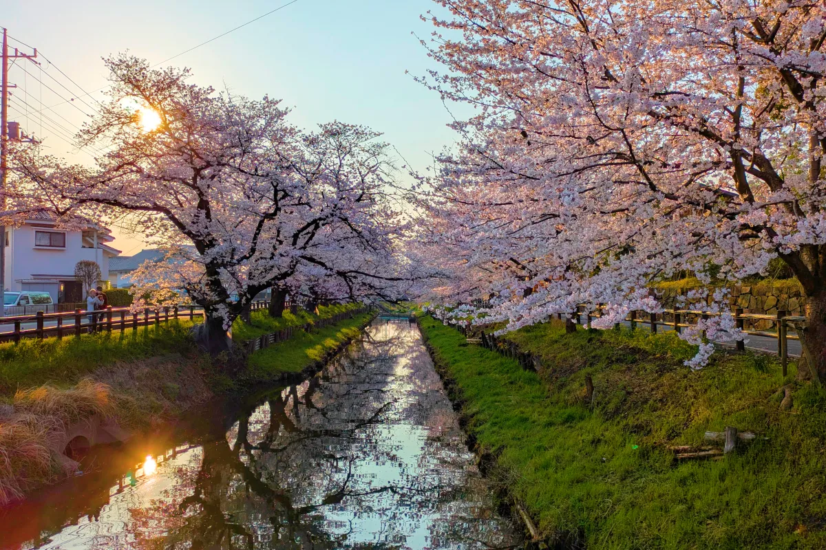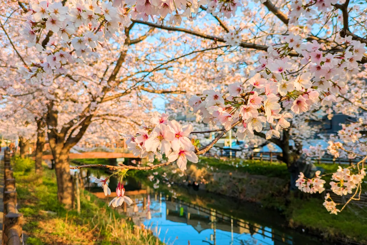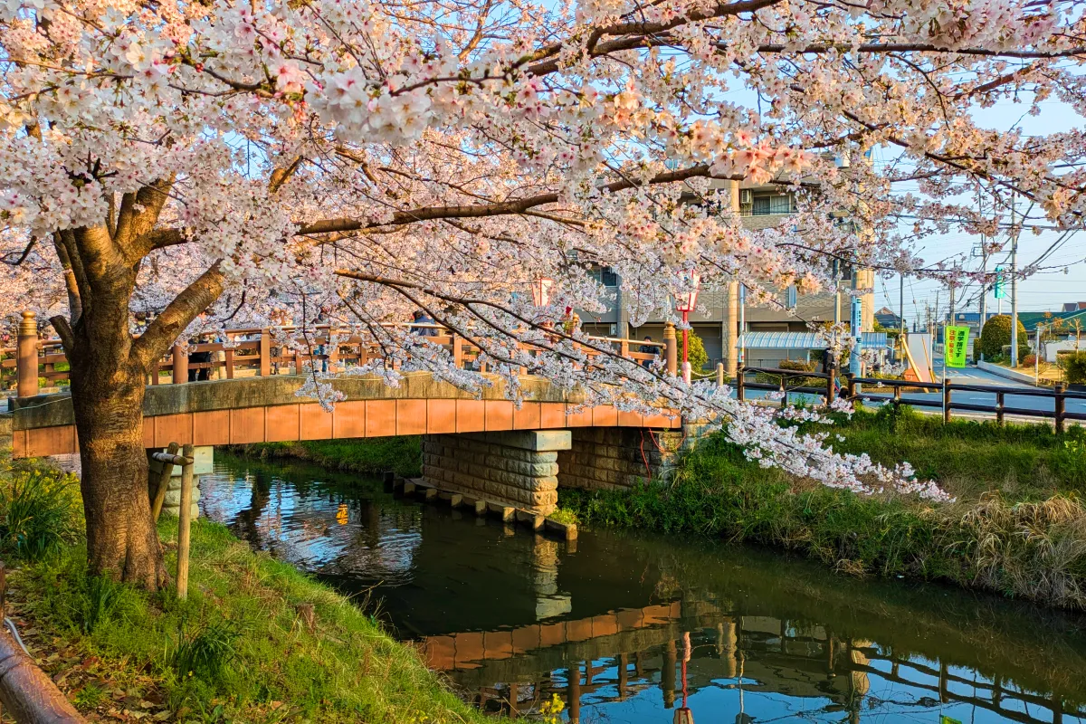 春になると川を覆うように咲き誇るソメイヨシノと、弧を描く橋のシルエットは、川越観光のなかでも特別な景色のひとつです。