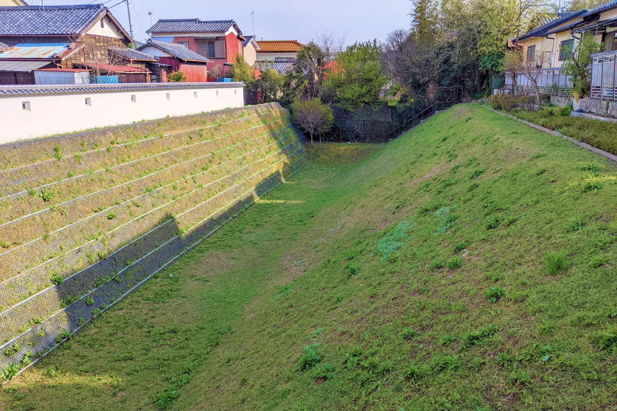 発掘調査をもとに当初の勾配を復元しており、深さ約7m・幅約18m。西大手門側は30度の緩やかな勾配なのに対し、本丸側は60度の急勾配で、侵入した敵には壁のように切り立って見えた構造になっています。