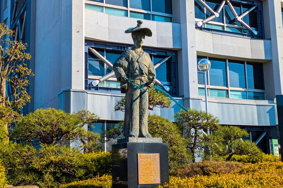 石碑のすぐ脇に建つ太田道灌像は、川越城・江戸城の築城者として知られる太田道灌を鷹狩りスタイルで表現したもの。右手には「山吹の里」の逸話にちなむ山吹の花を持っています。