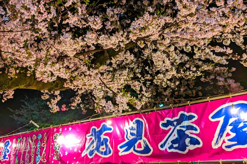桜の見頃には、花見茶屋という座ってビールややきとりを楽しめる屋台もあらわれます。