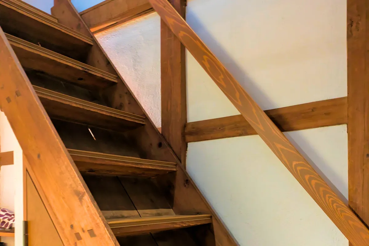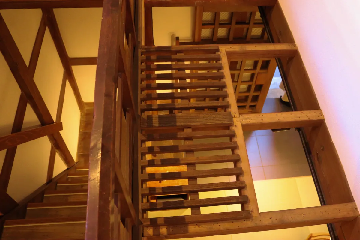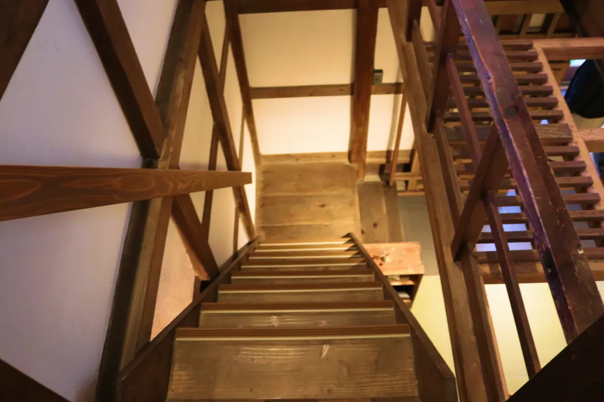 2階へ続く階段は、当時の趣を残した急勾配となっており、段差がやや高め。