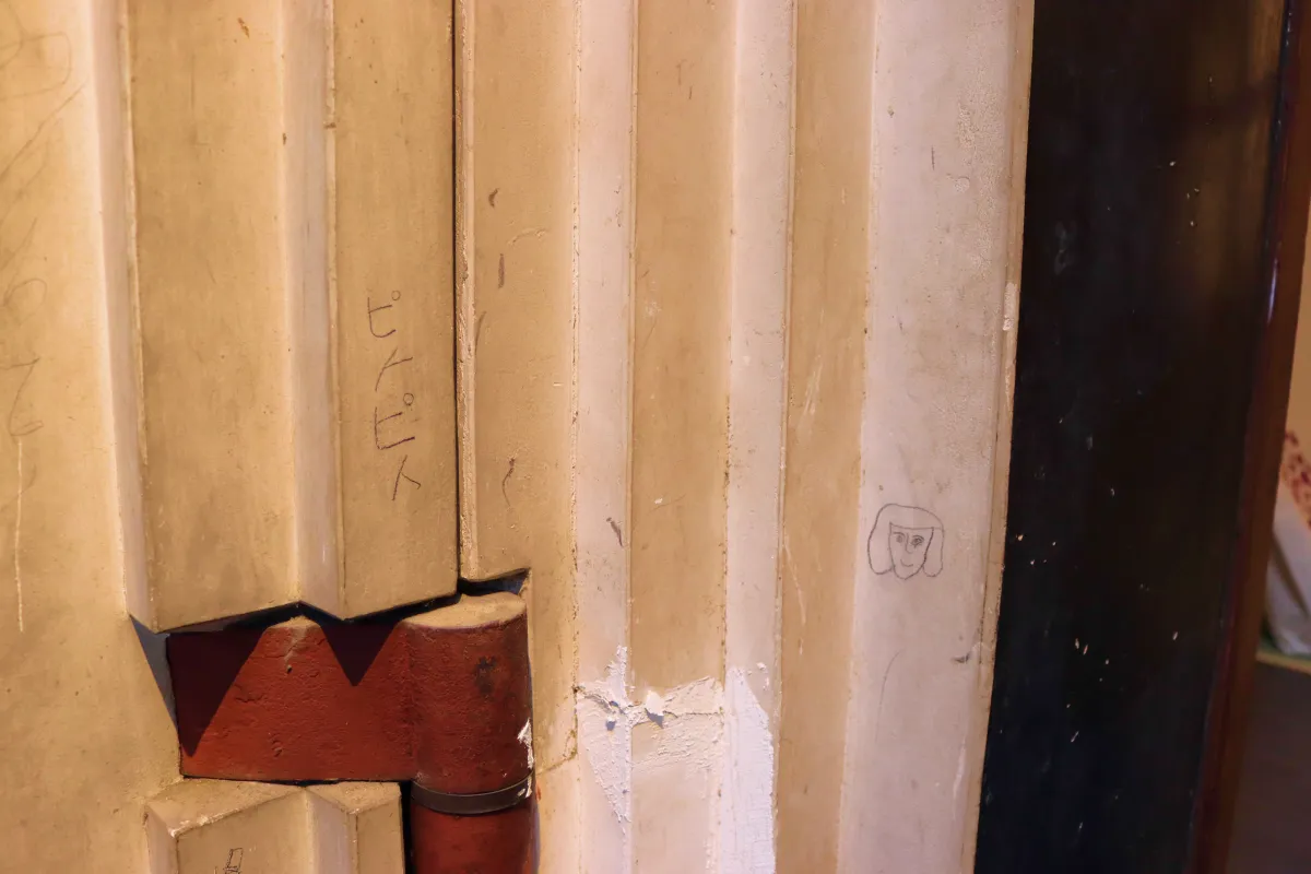 蔵の扉にかかれているピトピトという文字や似顔絵。