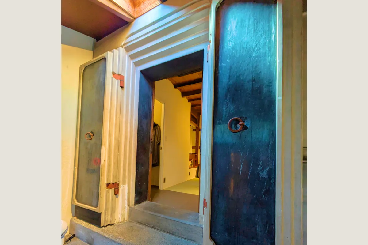 建物の扉を開けると、蔵の重厚感ある扉がきれいに残っています。