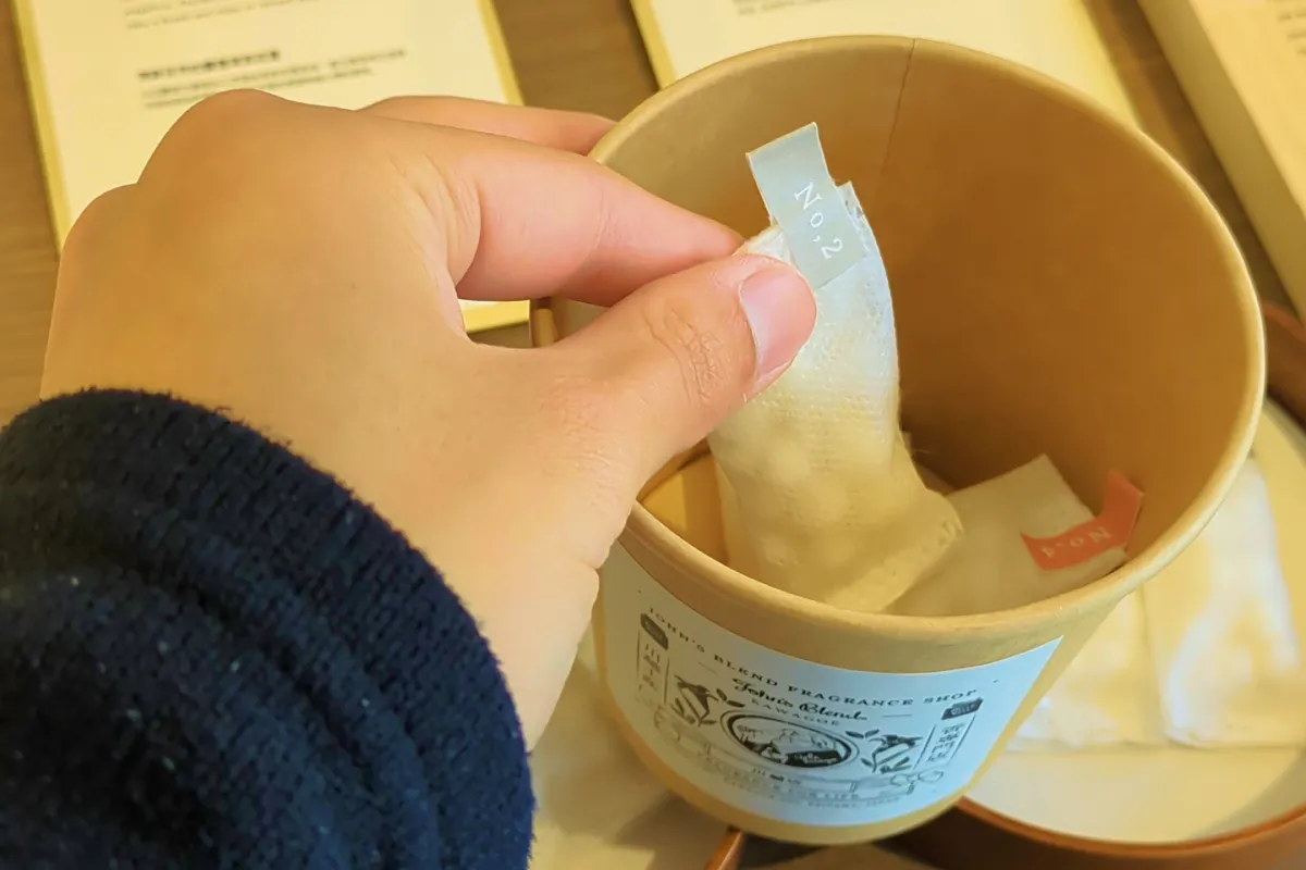 そして最初に3つの香りを選ぶときに使った容器はそのままサシェ袋のショッパーに!