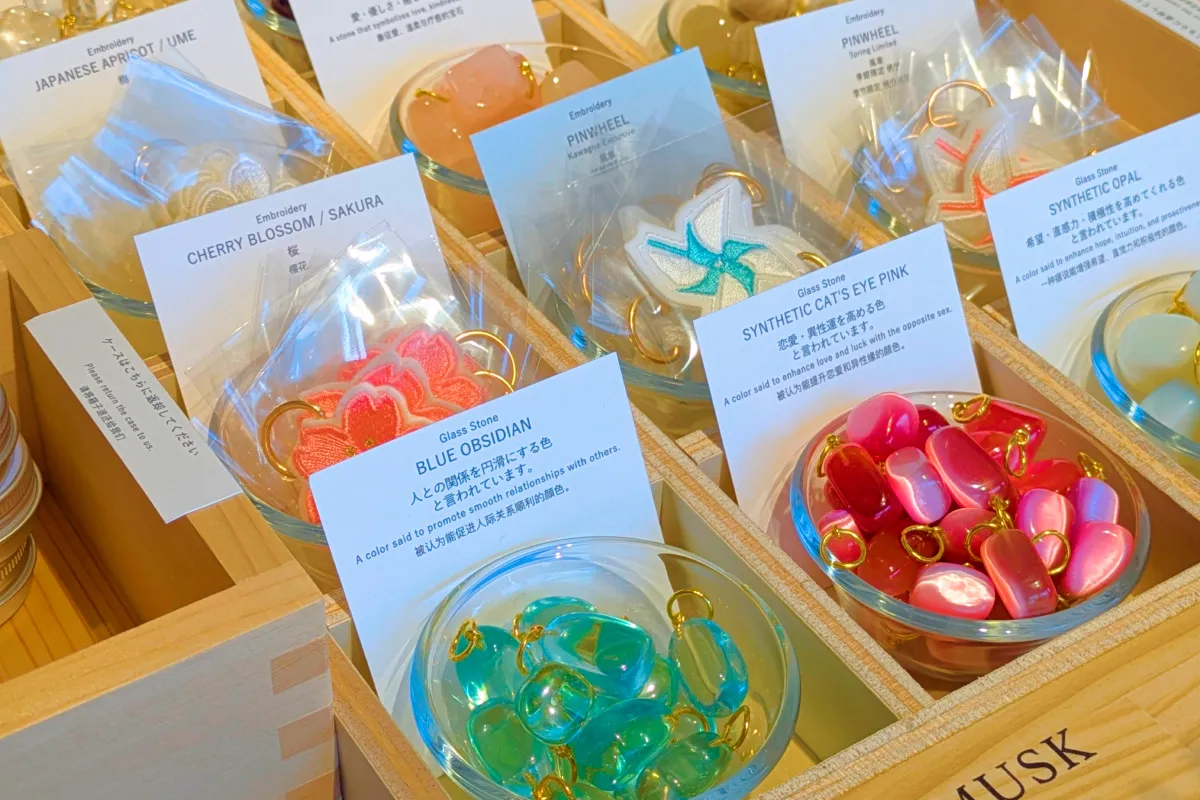 川越店限定の刺繍の風車チャームをはじめ、カラフルな天然石やガラス石、刺繍のチャームがあります。