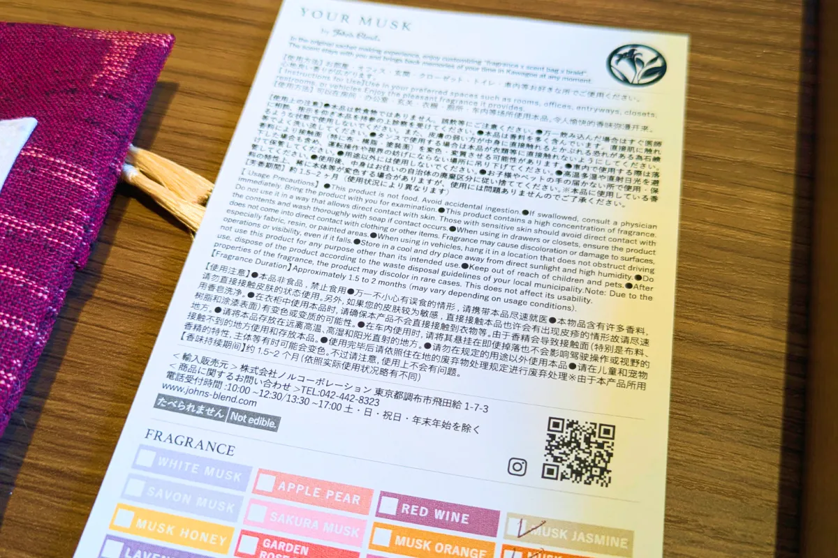 完成したサシェ袋とともに、使い方の説明書や今回選んだフレグランスを記載したシートが渡されます。